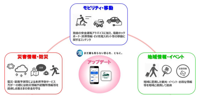 cmapアプリやGOアプリと連携し、天気予報・防災情報確認、タクシー配車サービスなどが利用できます。